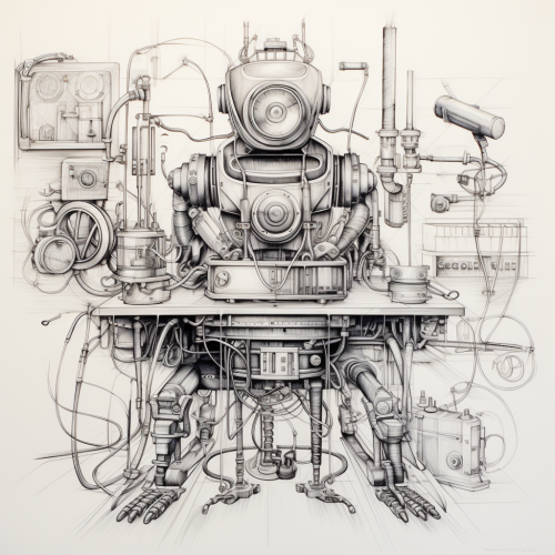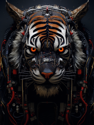 tiger robot face built into a wall covered in dark wires, chords, transistors, machine aesthetic, wallpaper, dark, --ar 9:12