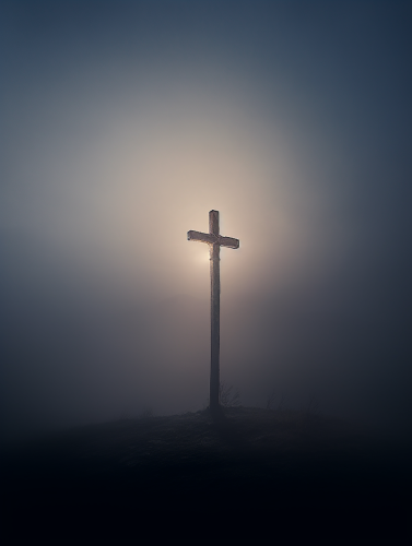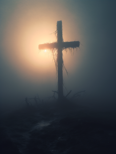 wide shot of an exotic cross distant in foggy sky, low light, glow, very detailed, high resolution digital camera --ar 3:4