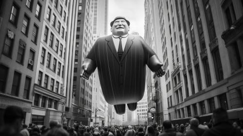 a giant inflatable liberace flying down the middle of wall street in 1942 black and white, high contrast --ar 16:9 --v 5.2