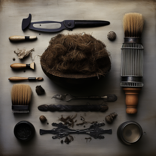 a composition of a siccor, hair comb, hair brush and other tools in the style of Irving Penn