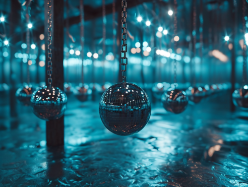 a straight on view of a hanging swing in the middle of a room full of disco balls, realistic, minimal, chain, 8k, tilt blue--stylize 50 --v 6.0 --ar 4:3