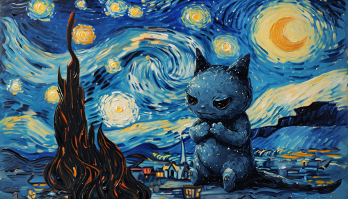oil painting of Japanese cute baby monster yokai, The Starry Night, painted by Van Gogh,abstract, --v 6.0 --ar 7:4