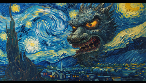 oil painting of Japanese yokai Kappa, The Starry Night, painted by Van Gogh,abstract, --v 6.0 --ar 7:4