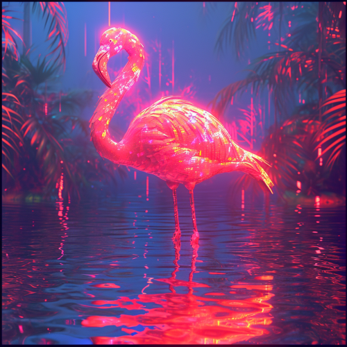 a flamingo, chilean landscapes, beautiful, dreamlike neonelectricecho, glitched render, glitchpunk mosaicsort happy bizarre calm tranquil euphoric --v 6.0 --s 250