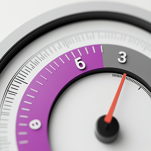 a visual representation of a risk score for sarcoma. The image should include three distinct zones: low, moderate, and high risk. A numerical value should be displayed in the center to indicate the specific risk level, with a high risk score being visually emphasized. The background of this photo should be white. the risk score screen white, grey and purple.