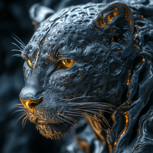 Head leopard in shades of grey, cool look, light golden tones incorporated, background is dark, visible details of the skin, 3D effect present --style raw --s 250