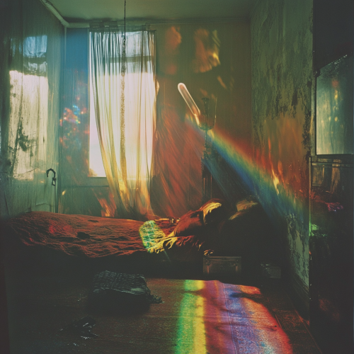 wolfgang tillmans photograph, mysterious room, dreamy, surreal, maximalist, very busy composition, dark, mysterious, complex lighting, rainbow, post punk aesthetic