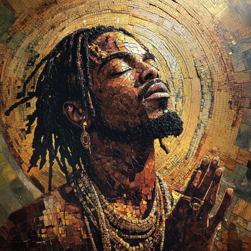 a musical album cover by an artist called jay deals for an album called vibe god in mosaic form. He is a powerful being who dominates the music he makes. Use the picture as reference for how he looks
