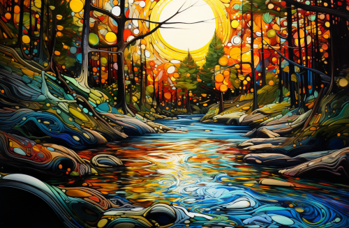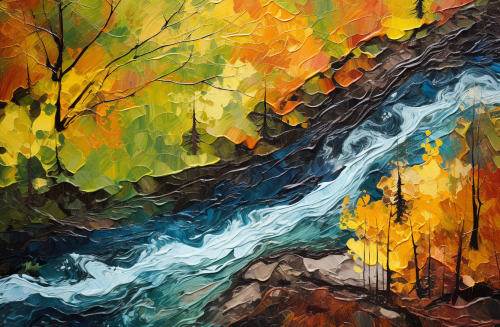 A space station view of a rapid river serpenting through a Canadian forest in autumn. Colorful, mesmerizing, serene, ethereal, variants of green, yellow, blue, red and brown. inspired by paul klee. impressionnist and expressionnist perspectives. hyper-detailed, hyper-contrast. --ar 32:21