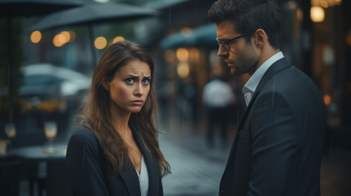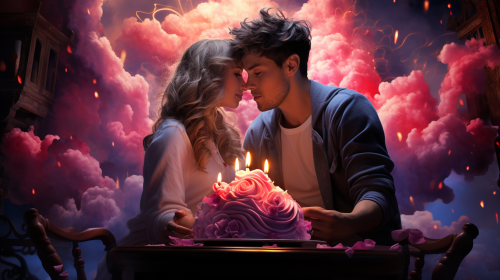big birthday cake, white icing and candles, couple in love kissing, red-purple-pink clouds, in dark and azure style, intense portrait, photorealistic composition, dreamy and romantic, --ar 16:9 --s 750 --v 5.2