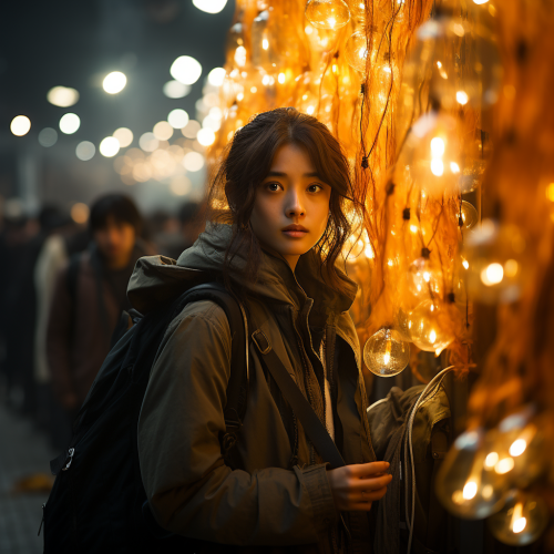 an asian girl is watching a very big glowing amber cocoon in a street of Seul, smoke in the background, canon 5d, 35mm --s 750