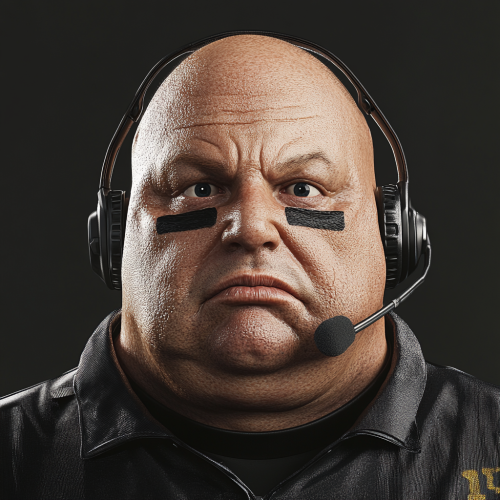 a profile picture of a fat head football coach that looks extremely ai generated. Make him deep in the uncanny valley but use realism as a style. Make sure he is wearing a headset