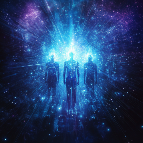 Please generate a photograph of 3 beings of light by manipulating a state-of-the-art computer in the center of these, the image contains blue colors, nebula purples and glow-type glows.