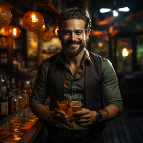 a male bartender holding a cocktail in one hand and money in the other hand --s 750