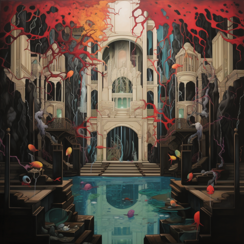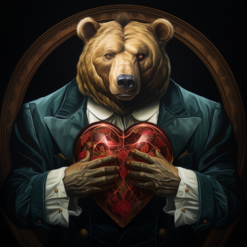 a man wearing a bear's head as clothing eating into a heart in the style of francois schuiten, 32k uhd, karl friedrich schinkel, hypnotic symmetry, inlay