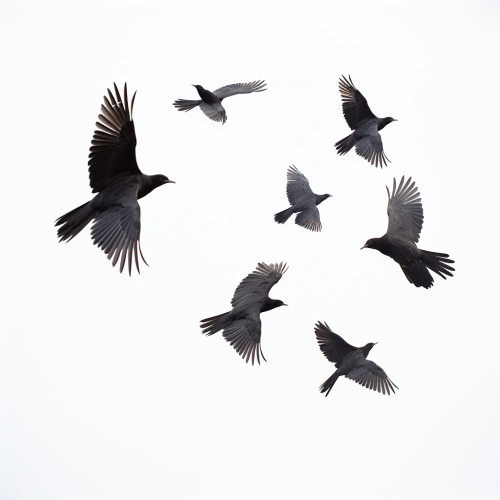 Please create a captivating image featuring black silhouetted birds in flight against a pristine white background. The birds should have a motion-blurred effect, capturing the graceful and dynamic movement of the flock. The image should be rendered in high-definition photo style, reminiscent of the clarity and detail of a lightbox film. The birds should be depicted in various stages of flight, with wings outstretched and bodies gracefully arched. Their silhouettes should be well-defined against the bright white background, creating a striking contrast. The motion-blurred effect should convey a sense of fluidity and energy, as if the birds are in constant motion across the frame. The lighting should be soft and diffused, enhancing the overall ethereal quality of the scene. Please ensure meticulous attention to detail to create a visually captivating and high-definition image that captures the beauty of birds in flight with a lightbox film aesthetic.