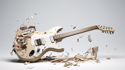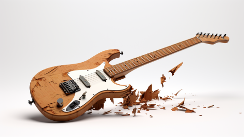 broken Ibanez electric guitar, splintered in pieces, set against a plain white backdrop, no shadows, 8k, 3d render, --ar 16:9