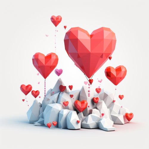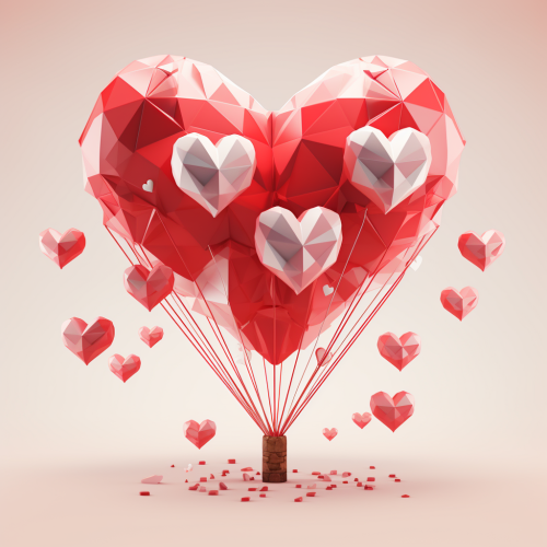 un grupo de corazones flotando, hechos de papel, o como globos, van de menos a mas, en un fondo blanco, lowpoly, como un torbellino, como una explosion desde un solo punto --v 5.2