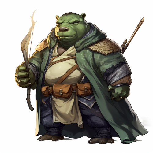 a dnd character image of a giff hippo man with a green cloak, bluish gray skin, amber eyes, a bow and arrow, and light armor