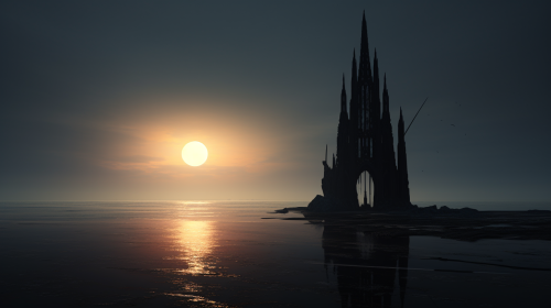 minimalisic, abstract, simple, plane,, sun, dramatic, old gothic cathedral as the main accent, ocean, california, --ar 16:9