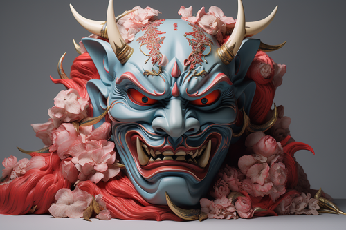 imagine a Hannya Nike Mask, rendered with blender 3d, pitcured in a white studio, empty, chromatic aberation, design, photographed on full frame large format, portra 400 --v 5.2 --ar 3:2 --s 250