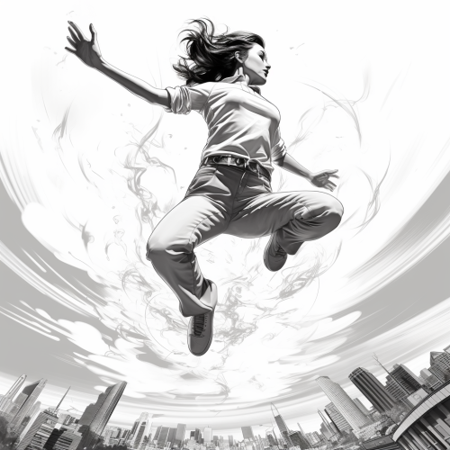 Maya balancing on a tightrope stretched between two office buildings,the tightrope symbolizes the precarious balance between ethics and challenges in the corporate world. --stylize 750 --ar 9:16 --v 6.1