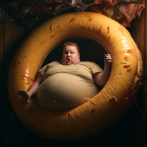 A person with a giant head trying to fit through a door frame and getting stuck, looking panicked