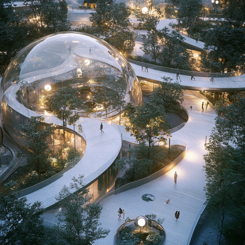 create a rendered image in a bubble form of a biopark area with curved walkways around and other public spaces like bioparks features around tanks, some greenhouse domes
