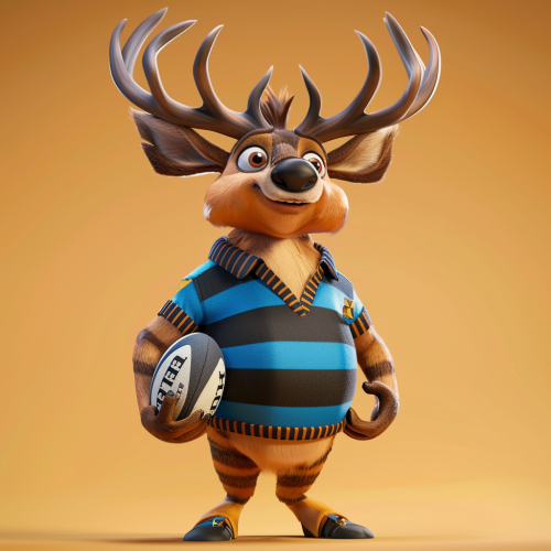 A 3D cartoon mascot of a stag, wearing a rugby uniform with blue and dark navy hoops, holding a rugby ball with matching blue and navy stripes, standing on a simple gradient background. The stag has detailed fur, a friendly and approachable expression, large cartoonish eyes, and distinctive branching antlers. Studio lighting, high detail, Pixar-inspired style, hd quality, soft shadows, centered composition, vibrant colors --ar 1:1 --v 6.0