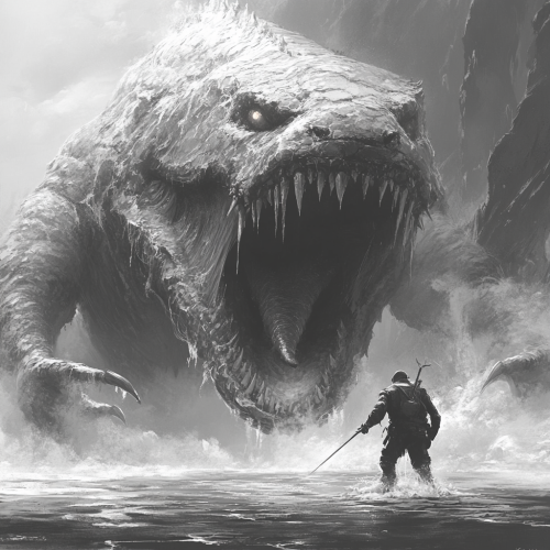 Frostlurks are gargantuan monstrosities, lanky but still lithe despite their size. They look fishlike with Scales as thick as bedrock, thin fish-like fangs as long as a human is tall, and radiate a chill. Their hands and feet are unlike anything you know of, but are perhaps closest to the talons of eagles.Thy have compound eyes like a bee. They have frills on their fidh like heads.