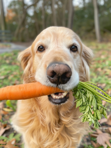 Very Realistic iPhone photo of a old golden retriever with a carrot in his mouth and he is looking at the camera and the picture is taken from the owners POV --v 6.0 --ar 3:4