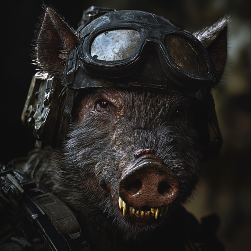 A rabid boar showing its teeth, with a black military tactical helmet, dressed in call of duty, with gunpowder on its face, no noise, soft shadows, front face photo --v 6.1