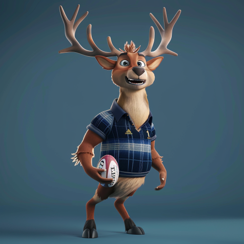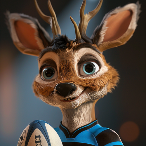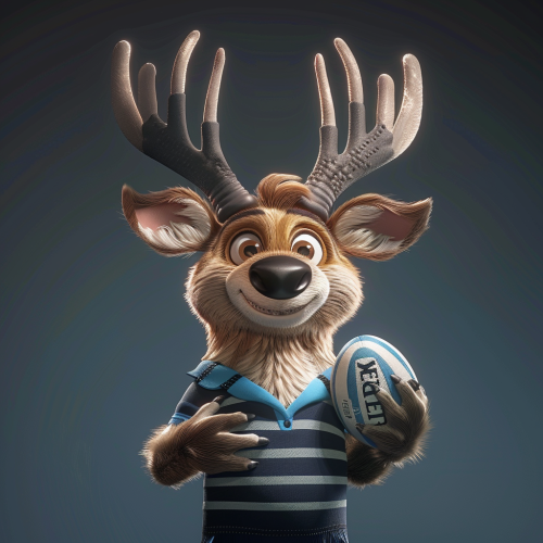 A close-up of a friendly stag mascot with big, expressive eyes and majestic antlers, dressed in a blue and black striped rugby shirt, holding a rugby ball close to his chest, soft smile, Pixar-style lighting, smooth gradient background, hd quality, intricate fur and fabric details, warm and vibrant lighting, 3D rendering, charming expression --ar 1:1 --v 6.0