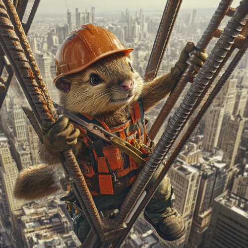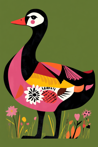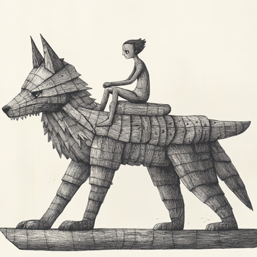 Create an Edward Gorey-inspired illustration featuring a person joyfully riding a large, wooden wolf sculpture with exaggerated, angular features. Use meticulous cross-hatching to convey the texture of the wood and the intricate, spiked details of the wolf’s body, creating a sense of depth and shadow. The person should have a simplified, whimsical design with minimal expression, capturing a moment of surreal joy. Place this scene in an open, industrial-like space, but keep the background minimal, using empty space to enhance the mysterious and slightly eerie quality. Incorporate symbolic motifs, such as a faint shadow or subtle texture, to heighten the sense of fantasy and surrealism.
