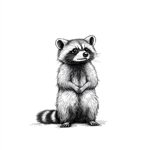 Full-body raccoon character in a minimalistic black line art style, with no shading or gray tones. Simple, hand-drawn look, clean black lines only, capturing the raccoon in a curious or playful pose. No background, purely line art, similar to a traditional ink outline drawing with clear contours and no extra details --s 250