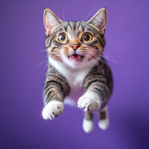 Happy cute cat. Smiling. Jumping. Trying to catch something. Front view. Magazine photo. Three flashlight sources. Natural light. Gradient light background. Purple plain background. Photo direction. Art direction.4