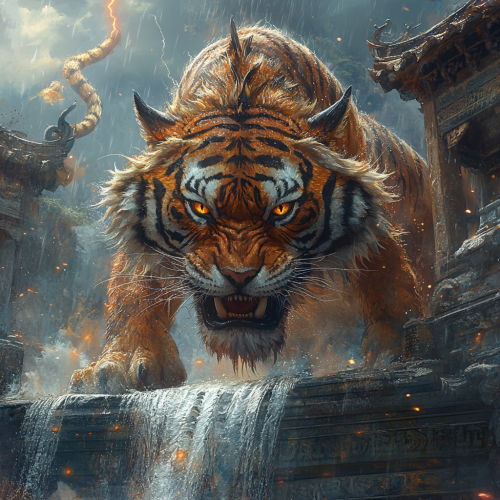 A majestic dragon with iridescent scales and piercing eyes coils around an ancient stone temple, staring down a formidable tiger with golden fur and blazing amber eyes. The tiger stands on a high ledge above a waterfall, snarling defiantly. The background sky is dark and stormy, with flashes of lightning illuminating the intense standoff. Mist rises from the waterfall, adding a mystical and dramatic atmosphere. --s 750 --v 6.1