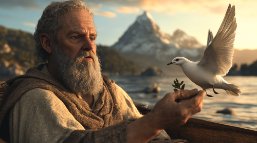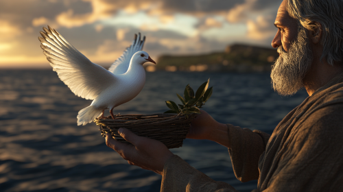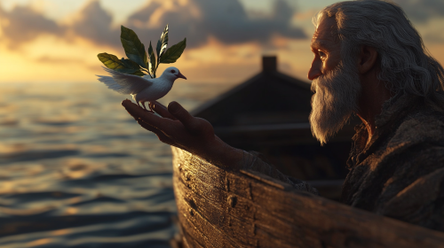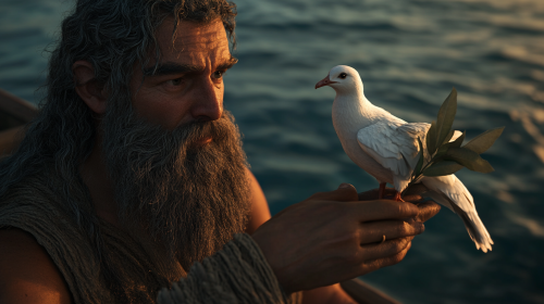 in the context of Genesis 8:11, generate an image of Noah in the ark, Noah is holding a dove in his hand, the dove has in its beak an olive leaf, it's evening time, the ark is floating in the ocean, photorealistic, Cinematic, 10k, high quality, intricate details --aspect 16:9