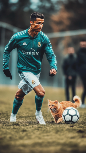cristiano Ronaldo training football dressed as real madrid. He is training with an orange cat in the field, the cat is also dressed as real madrid UHD action --ar 9:16
