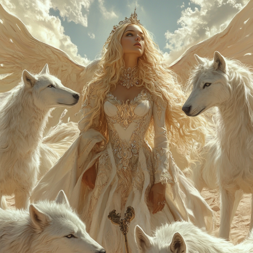 angelic blonde haired queen in the desert surrounded by white wolves and white unicorns. we see a very serious look on her face as she holds the key to destiny.