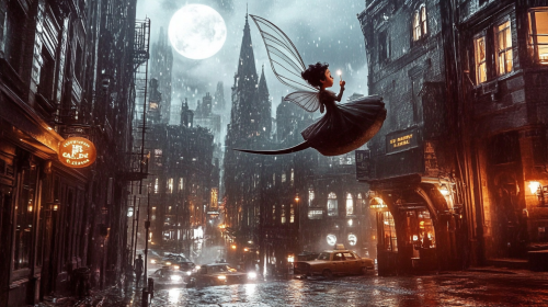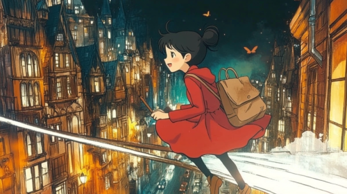 2D cute cartoon. An image to use as the city pop music video wallpaper. The appearance of Kiki the Witch's Delivery Service looking at the night background of the city. Expressed elaborately. --chaos 40 --ar 16:9 --weird 300 --v 6.1