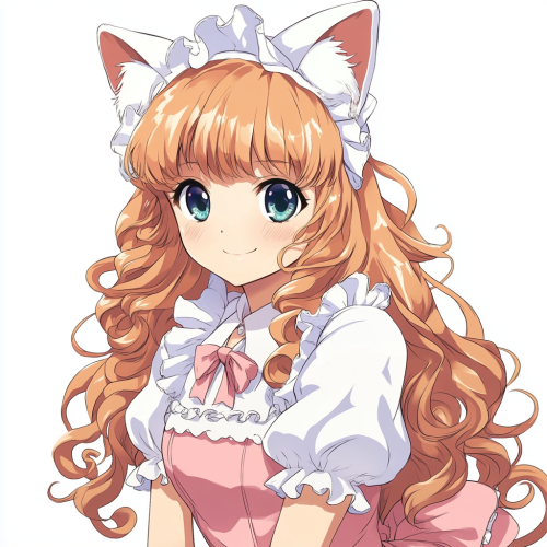 90s anime style character with minimal edits: a cute catgirl with long, strawberry blonde curls wearing a pink and white frilly maid uniform, with white fur cat ears.