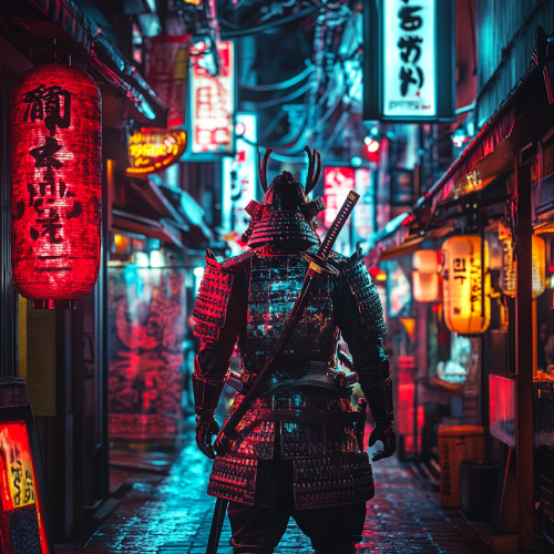 The samurai is wandering through a narrow, neon-lit alley in Tokyo, surrounded by modern signs and advertisements. The vibrant colors of the lights reflect off his armor, creating a surreal and almost cyberpunk atmosphere. His expression might show a mix of curiosity and unease as he navigates the crowded, unfamiliar environment.