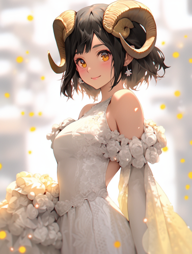 Abedo, head goat horns, shoulder-length black hair, dieuchromatic yellow and gray, wedding dress, happy, whole body beautiful anime style woman, clean and meticulous face, complex clothing, similar colors, glowing shadows, deep field, high quality, high detail, high definition, luminous studio graphics engine, cute face, slender waist, beautiful hips, 90s anime style VHS --ar 3:4 --niji 5