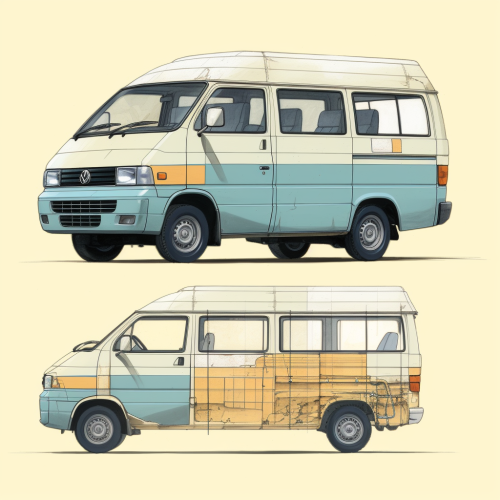 blueprints for a mitsubishi carry, toyota hiace, small kei car, van, stylized, anime, colors, watercolor, ghibli, side view, top view front view