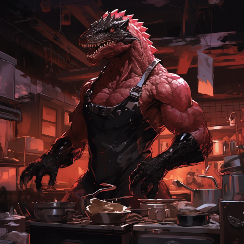 a buff robotic black and crimson dinosaur; in an apron; cooking up meals; in the style of black lagoon anime