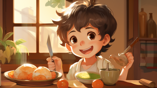 In a breakfast scene, there is a boy of elementary school age. He has a cheerful and bright smile on his face, holding an egg in one hand. This scene is depicted in the style of a Japanese anime illustration. --ar 16:9