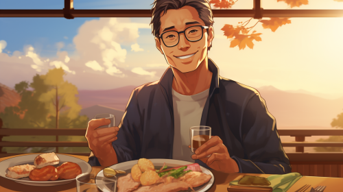 In a breakfast scene, at the dining table, there's a father in his thirties wearing round glasses. He has a bright and cheerful smile on his face and holds an egg in one hand. This scene is depicted in the style of Japanese anime illustration. --ar 16:9