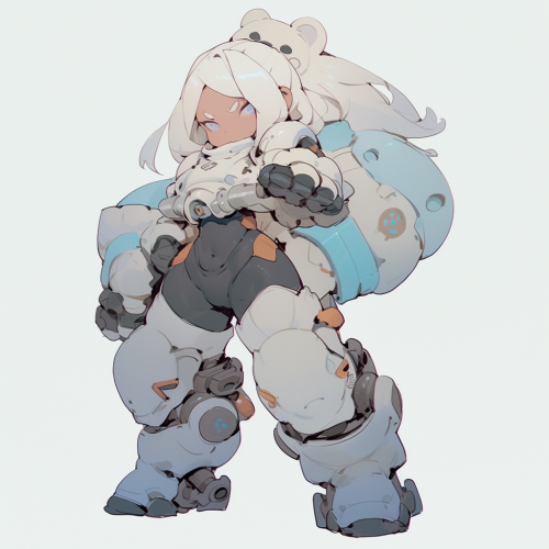 A chibi Her head looks like a polar bear, she has a shield in his hand, style anime girl. She have white hair. She is serious and old from overwatch My Hero Academia style, full body view, --niji 5 --style expressive --s 250