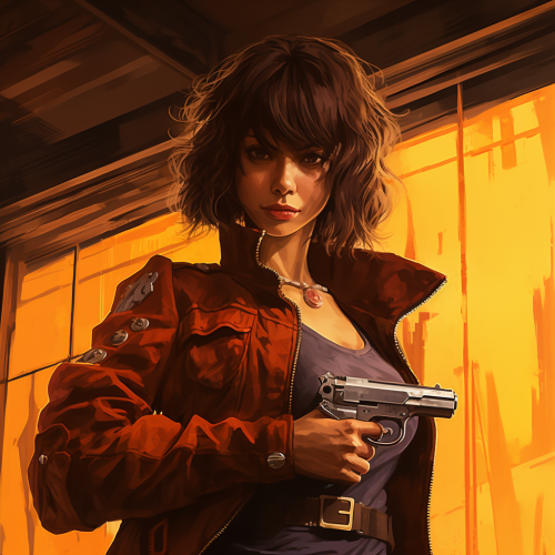 In the style of Grand theft auto promotional art. A japanese matriarch with grey hair in a red suit chokes a man and presses him against the wall of her luxury penthouse office. Cell shaded. Retro.